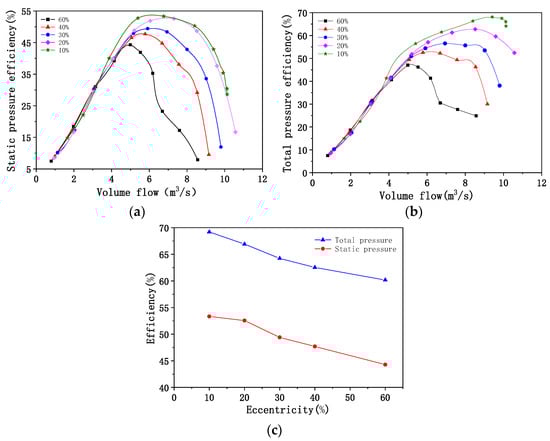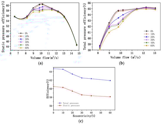 Comparison of efficiency under different eccentricities: (a) comparison of static pressure efficiency under different eccentricities; (b) comparison of total pressure efficiency under different eccentricities; (c) comparison of peak efficiency under different eccentricities.