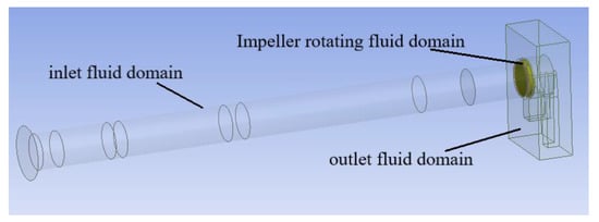 After the model was simplified in the UG, it was imported into Design Modeler (DM) software. This imported model is repaired with small features, and the fluid domain is extracted in DM. As observed in Figure 6, the fluid domain is divided into inlet fluid domain, outlet fluid domain, and impeller rotating fluid domain due to the different requirements for the grid quality of the different fluid domains.