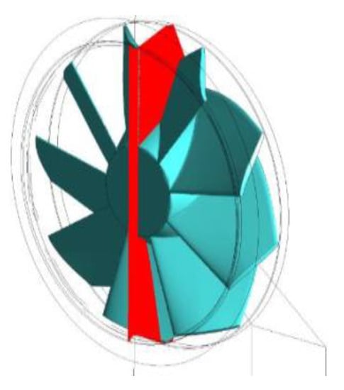 Since the leakage flow forms leakage vortices of different sizes in the impeller passage under different clearances, it has a large impact on the flow field of the impeller. Therefore, the influence of leakage flow with different clearances on the flow field is investigated. In order to observe the turbulent kinetic energy at the clearance, the transverse section of the impeller is taken as shown in Figure 10.