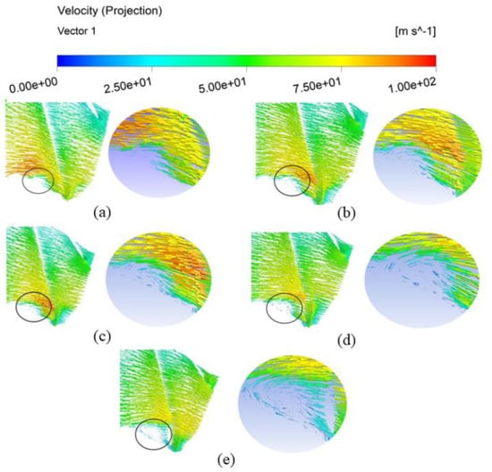 The velocity distributions at the tip clearances of 1.5 mm, 2.5 mm, 3 mm, 4.2 mm, and 7.2 mm at a flow rate of 9.8 m3/s are shown in Figure 9. It is evident that the flow direction at the tip clearance is opposite to the mainstream direction, i.e., the formation of backflow phenomenon. Meanwhile, a vortex is generated on the suction surface of the impeller. This can be attributed to the airflow at the tip area of the impeller flowing from the impeller pressure surface through the tip clearance to the impeller suction surface. A leakage flow at the tip clearance leads to a leakage vortex near the clearance.