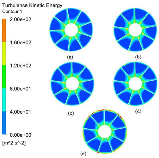 Turbulent kinetic energy diagram of tip clearance: (a) 1.5 mm; (b) 2.5 mm; (c) 3 mm; (d) 4.2 mm; (e) 7.2 mm.