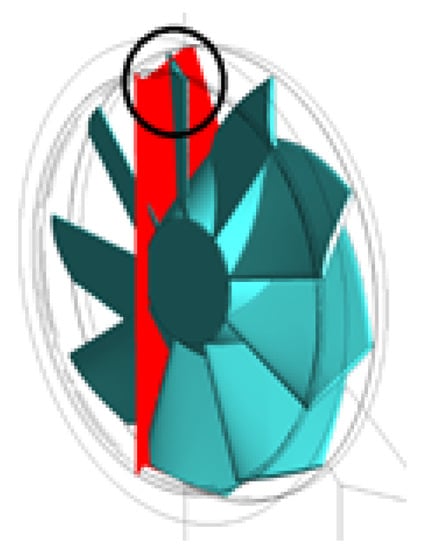 To analyze the effect of eccentricity on the velocity, the cross section shown in Figure 13 is intercepted and the velocity distribution of the impeller is observed at the circled position.