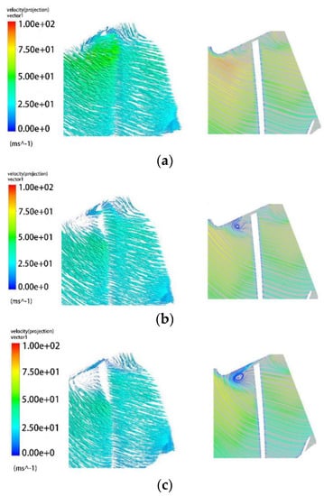 The velocity and streamline distribution of the impeller corresponding to the position indicated in Figure 13 with eccentricities of 10%, 30%, and 60% are described in Figure 14. It is obvious that the downward eccentricity of the impeller leads to the increase of the leakage at the clearance of the upper part of the impeller. The airflow from the pressure surface to the suction surface at the clearance of upper part of the impeller increases, and the size and range of the leakage vortex increases, as the eccentricity increases.