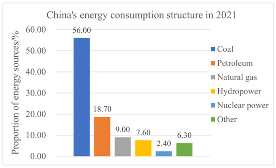 Coal is one of the important energy sources for human survival and has played an essential role in global economic development. China is also the world’s largest coal producer and consumer, and China’s energy consumption structure will continue to be dominated by coal for a long time to come [1,2]. In 2021, China’s energy consumption structure is shown in Figure 1, of which coal energy consumption accounted for 56%. Additionally, in the process of energy structure transformation, coal should play a leading role. However, gangue is a kind of solid waste with low carbon content emitted in the process of coal mining. Its main chemical components are SiO2 and Al2O3 [3,4]. Raw coal mixed with gangue will not only reduce the quality of coal but also seriously pollute the atmospheric environment when burned. Therefore, coal gangue identification and separation is a vital part of the coal production process. In China, the coal industry will enter a stage of high-quality development, and the Chinese government is actively promoting efficient, clean, and green coal mining [5,6,7,8].