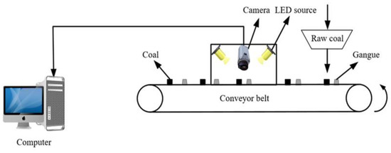 The experimental samples of coal and gangue were selected from the coal mine in Panji District, Huainan, Anhui Province, China. The particle size of coal and gangue was distributed in 40–100 mm. Among them, the surface of the sample coal was black and shiny, with a few cracks and soft texture, while the surface of gangue was black–gray, dull and rough, and hard in texture. To realize acquisition of coal and gangue images, we imitate the actual working environment of the underground to build a machine vision experimental platform in the laboratory, as shown in Figure 2, and the platform consists of a conveyor belt, charge coupled device (CCD) industrial camera, USB3.0 data cable, double LED light as a light source, and computer. CCD industrial camera is the core equipment of the image acquisition device; selection of the camera determines the resolution and image quality of the acquired images. The camera model used in this experiment is Hikvision MV-CA050-11UC 5-million-pixel color camera, which supports manual adjustment of gain and exposure time, the resolution is 2448 × 2048, and frame rate is 35 fps. Using USB 3.0 data interface communication and connection to the computer, the camera can collect images of coal and gangue in real time. The light intensity during the experiment is 2000 Lux, and the speed of the conveyor belt is 0.2 m/s.
