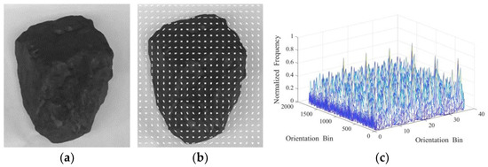 HOG feature visualization of coal. (a) Original image; (b) HOG feature diagram; (c) HOG feature histogram.