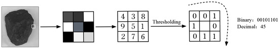 LBP is a kind of operator, which is used to describe the local texture feature of an image [37]. It has strong classification ability, high computational efficiency, and invariability to monotonous grayscale change. This operator was originally proposed by Ajala et al. in 1994 [38], and the original LBP operator is calculated as shown in Figure 5, and the calculation formula is: