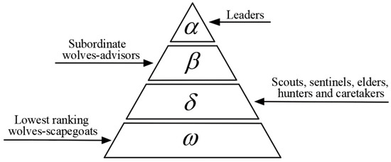 GWO is a swarm intelligence optimization algorithm proposed by Australian scholars Mirjalili et al. in 2014 [43]. The algorithm is inspired by grey wolf predation prey activities and developed an optimized search method, which has the advantages of strong convergence performance and few parameters. In recent years, it has been widely studied by scholars and has been successfully applied to parameter optimization, fault diagnosis, image classification, and other fields [44,45]. GWO algorithm imitates the leadership level and hunting mechanism of the grey wolf in nature [46]. It consists of four kinds of grey wolves, Alpha (), Beta (), Delta (), and Omega (), which are used to simulate the various classes of grey wolves. The hierarchy of grey wolves is shown in Figure 9.