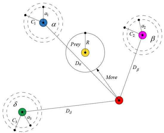 where is the maximum number of iterations. The hunting process is usually led by wolves, wolves, and wolves will guide the wolves to surround the prey. However, in the search space, we do not know the best position of the prey; therefore, we assume that wolves, wolves, and wolves have a better understanding of the location of prey. The change in the location of the wolf pack round-up prey is formulated as follows: