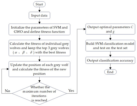 Based on the advantages of GWO algorithm, such as simplicity and less parameter setting, the method proposed in this paper is to optimize the parameters of SVM by GWO algorithm, obtain the best penalty factor C and kernel function parameter g of SVM through iterative optimization, and improve the training speed, generalization ability, and classification accuracy of the model. Finally, the flow chart of the GWO-SVM model proposed in this paper is shown in Figure 11.