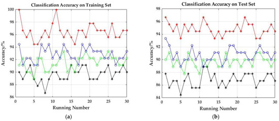 (a) Classification accuracy on the training set; (b) classification accuracy on the test set. Red *: GWO-SVM; blue circles: PSO-SVM; green circles: GA-SVM; black *: SVM.