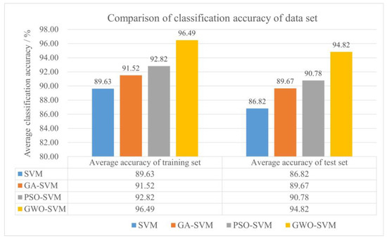 Figure 13 is a columnar diagram of the dataset classification accuracy comparison. As can be seen from the figure, the proposed method has higher classification accuracy on the training set and test set than other classification models, and the GWO-SVM method has an average accuracy of 96.49% and 94.82% on the training set and test set, respectively. That is, the GWO-SVM model is best classified under the condition of same training sample. In fact, compared with other intelligent optimization algorithms, the grey wolf algorithm can accurately find the best penalty factor C and kernel function parameter g of SVM, which can improve the classification accuracy of the model, which is also the feasibility and superiority of the method proposed in this paper.