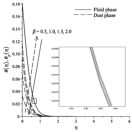 decreases on account of dust particles are adjusting its velocities to be in the same rate with the motion of fluid. This motivates the dust particles to accelerate until they reach the maximum fluid flow. Consequently, the fluid physically experiences drag forces (Stoke’s Law) when in contact with the dust particles, causing the fluid motion along with its associated momentum boundary layer to retard. A similar trend is observed in the temperature of both phases when