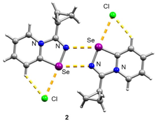 Initial 1,2,4-selenodiazolium chlorides 1–4 were simply prepared in 85–93% yields according to our method [7,10]. Compound 2 was recrystallized from CH2Cl2 to give a single crystal, which was analyzed by the X-ray structural analysis, which showed that 2 forms Se2N2 squares in the solid form—the structural motif, which is typical for 1,2,4-selenodiazolium chlorides (Figure 1).