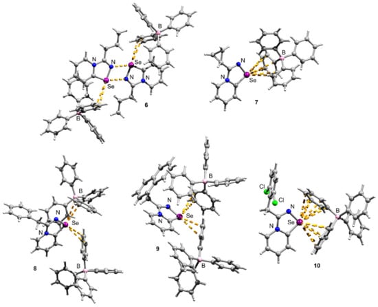 Compounds 6–10 featured multiple Se···π ChB contacts in the solid state; however, the geometry of Se···π interactions was slightly different in all the cases. It should be noted that Se···π interactions are relatively rare, although S···π contacts are better documented [17,18].