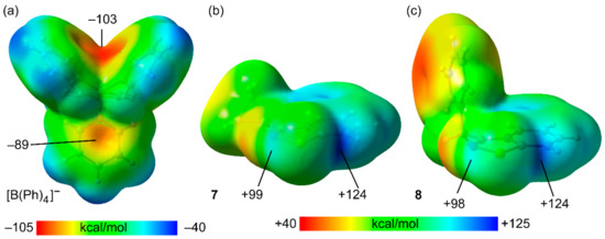 MEP surfaces of compound the tetraphenylborate (a), and the cationic units of compounds 7 (b) and 8 (c) at the PBE0-D3/def2-TZVP level of theory. Values in kcal/mol.