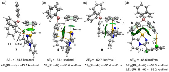 In order to better understand the Se⋯π ChB in 7–10, we carried out density functional theory (DFT) studies. As a starting point, the molecular electrostatic potential (MEP) surfaces of the anion and two selenodiazolium cations (Cyp and Bn-substituted) were computed. The MEP surfaces are plotted in Figure 3, along with the values at the phenyl rings of the anion and both σ-holes of the selenium atom. Regarding the anion, the MEP surface reveals that the MEP minimum is located in the region under the influence of two phenyl rings of the anion (−103 kcal/mol) see Figure 4a. The MEP is less negative at the opposite side of the phenyl rings −89 kcal/mol. In both cations, the deeper σ-hole (124 kcal/mol) is found to be the opposite to the N–Se due to the overlap with the positive and adjacent H-atom of the pyridyl ring (see Figure 4b,c). The MEP value at the other σ-hole (opposite to C–Se bond) is almost identical in both cations and around 25 kcal/mol less positive than that opposite to the N–Se bond.