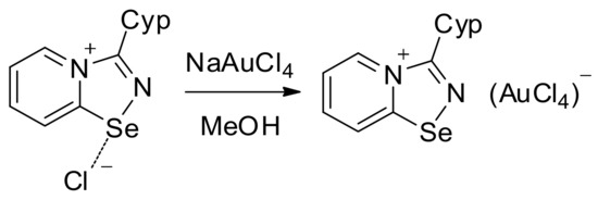 For the Cyp selenodiazolium derivative 11 with AuCl4 anion, we also managed to obtain single crystals and characterize them by means of the X-ray structural analysis (Figure 3). The addition of NaAuCl4 to 2 in MeOH resulted in the formation of a microcrystalline precipitate of 11 (Scheme 2). Isolation and analysis of the solids (see SI) suggested the formation of AuCl4 salt.