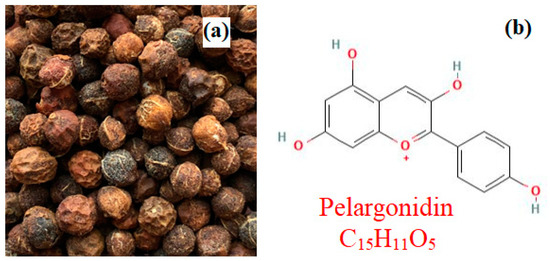 Tectona grandis, usually known as teak or Sagun, is a strong, tall and high timber-valued tree. Its dry fruits are dark brownish black, spherical-shaped ones and shown in Figure 1a; the pelargonidin dye structure is depicted in Figure 1b.