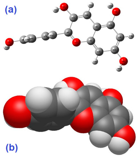 Optimized molecular structure (a) and van der Waals prediction of pelargonidin (b).
