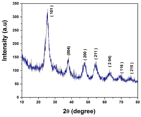 The PXRD of pure TiO2 after calcination at 250 °C portrayed in Figure 3 shows the diffraction peaks (101), (004), (200), (211), (204), (116) and (215). This confirms the anatase phase of TiO2 which possesses better photocatalytic properties than rutile and brookite phases. In addition, the diffraction peaks related to rutile and brookite phases do not exist. The average grain size obtained by Scherrer’s equation, D = Kλ/(βcosθ), is approximately 43 nm.