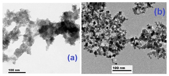 TEM images of pure TiO2 by sol-gel process (a) and commercial P25 Degussa TiO2 (b).