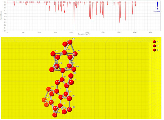 The calculated intensity of each band for each of the N vibrational modes is given by Akin km/mol. Figure 5 shows observed FTIR spectra for PGN. For the wavelength range of 4000–400 cm−1, a thorough analysis of the infrared spectra of PGN-substituted derivatives in the solid and solution has been reported [24,25,26]. Table 1 lists the vibrational spectra of the compound prepared for this study. The vibrational assignments were calculated using crystal maker software. Wagging frequencies are in the neighborhood of 519 cm−1 with a second component of frequency around 809 cm−1 and a third set of scissoring at approximately 1329 cm−1. The strong bands appearing in the spectrum at about 2117–3954 cm−1 are typical of C-H symmetric and asymmetric stretching. The band observed at 2117.24 cm−1 is due to C-H stretching with a strong peak. These assignments agree with the spectral work results for a compound that is present in solid form as a strongly hydrogen-bonded acid. Due to the aromatic C-C-C stretching vibrations, aromatic compounds frequently display numerous weak bands at 1948.56 cm−1 and 2467.12 cm−1.