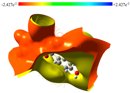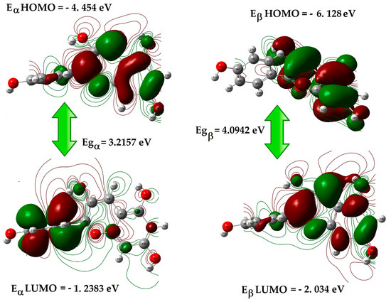 The strength and stability of transition metal complexes, as well as the colors generated in solution, can be predicted using frontier molecular theory. The boundary molecular orbitals are HOMO and LUMO, which are implicated in chemical stability and lower reactivity in chemical processes [28,29]. The HOMO reflects the flexibility to offer the capacity to receive an electron; LUMO is an electron mediator [30]. This electron absorption transition occurs concurrently with the transition from lowest to first excited level and is principally represented by the excitation of an electron from the HOMO to the LUMO. The frontier orbital distance aids in distinguishing between the kinetic and chemical stability of molecular system reactivity [31]. Figure 6 depicts the atomic orbital composition, with positive and negative interactions characterized by red and green colors, respectively. PGN’s HOMO, LUMO and frontier orbital gap energies of α and β spin symmetries are −4.454, −1.2383, −6.1282 and −2.034 eV, respectively.