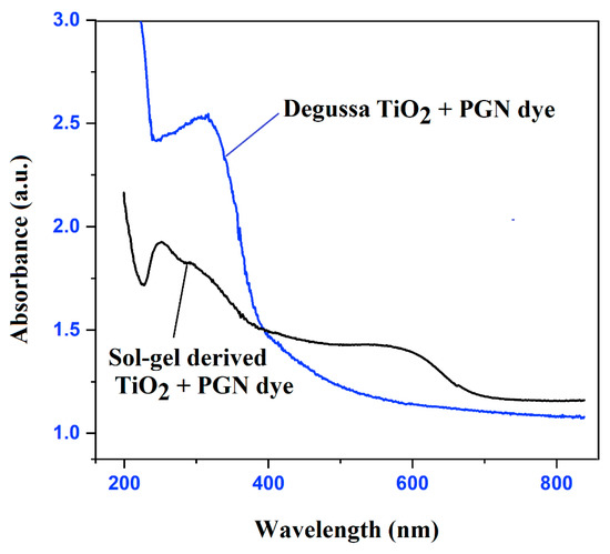 UV–Vis spectra of pelargonidin-sensitized sol-gel-derived TiO2 and Degussa TiO2.