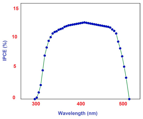 The incident photon to current conversion efficiency (IPCE) is very useful in evaluating the performance of solar cells. This measures the efficiency of incident photons converted into photocurrent flowing between the working and counter electrodes. The natural dye extracted from Tectona grandis seeds containing pelargonidin pigment as an acceptor exhibited stronger solar cell response in the 300–500 nm spectral region. The external quantum efficiency at any wavelength λ is [33,34]: