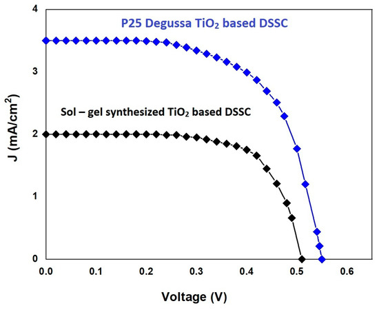 The current-voltage characteristics of conventional sol-gel-prepared and P25 Degussa TiO2-based DSSCs in Figure 10 show the values of Jsc as 2 mAcm−2 and 4.9 mAcm−2, and Voc as 0.42 V and 0.55 V, respectively. Their fill factors are 68% and 61.6%, respectively. The light-to-electron conversion efficiency (η) of pure TiO2-based DSSC was 0.68% and that of commercial P25 Degussa TiO2-based DSSC was 1.18%. The Isc and η were found to be higher for P25 TiO2-based DSSC than for synthesized TiO2-based DSSC. This is attributed to more dye adsorption, superior morphology, abridged agglomeration and fewer colorant aggregations in commercial TiO2 nanomaterials. Therefore, the pelargonidin photosensitizer extracted from Tectona grandis seeds is an operative photosensitizer for generating DSSCs with improved proficiency.
