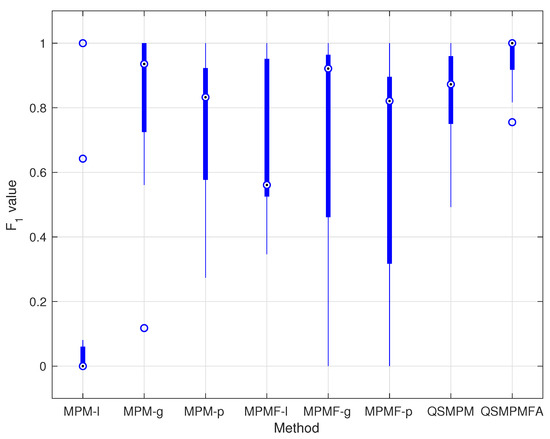 Table 2 shows the value of each method on all the datasets. The bold ones are the best results among all the methods. “-” indicates that the memory exceeds the limit in the training process. From Table 2, it can be seen that QSMPMFA outperforms the comparison methods for classifying most datasets, especially on datasets with higher imbalance ratios such as Segment, Dry Bean, Skin, and so on. For the other datasets that QSMPMFA performs not optimally on, it can be seen that the best results often occur in the methods with Gaussian kernel functions. The reason may be that the Gaussian kernel is more proper for dealing with these datasets. For showing the results more intuitively, the boxplot of the value of the positive class of each method for classifying all the datasets is illustrated in Figure 1.