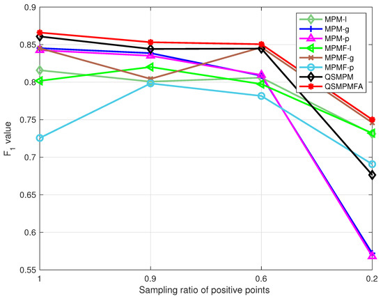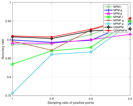 The comparison results of MPM-l, MPM-g, MPM-p, MPMF-l, MPMF-g, MPM-p, QSMPM, and QSMPMFA on the four datasets are illustrated in Figure 3 and Figure 4. It can be seen that the proposed QSMPMFA performs the best for classifying all the datasets. As shown in Figure 3, the values of each method on each dataset show a decreasing trend overall when the ratio of positive points decreases (i.e., the imbalance degree increases). The variation of the values of the proposed QSMPMFA is relatively stable. The other methods, especially MPM-g, MPM-p, and QSMPM, decrease more significantly when the ratio is small. From Figure 4, it can be seen that the accuracy rate of each method on each dataset increase overall when the ratio of positive points decreases (i.e., the imbalance degree increases). The performance of QSMPMFA is also relatively stable. Although the accuracy rate is not a proper measure for analyzing the imbalanced dataset, it still demonstrates the better performance of the proposed method. When compared with QSMPM, the relatively large growth rate shows the better performance of the proposed method, which further demonstrates the superior performance for classifying imbalanced datasets.