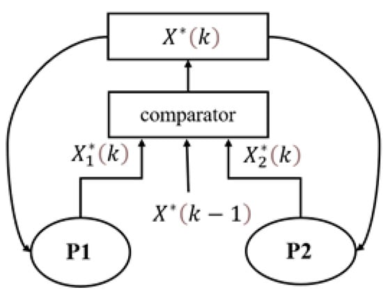 Diagram of the proposed communication mechanism between dual subpopulations. Note that the comparator performs the operation of Equations (13) and (14).