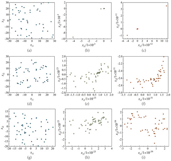 Population distributions obtained by the WOA, COBLWOA, and LCOBLWOA. (a–c) The population distribution obtained by the WOA at the 1st, 60th, and 84th iteration, respectively. (d–f) The population distribution obtained by the COBLWOA at the 1st, 60th, and 84th iteration, respectively. (g–i) The population distribution obtained by the LCOBLWOA at the 1st, 60th, and 84th iteration, respectively.