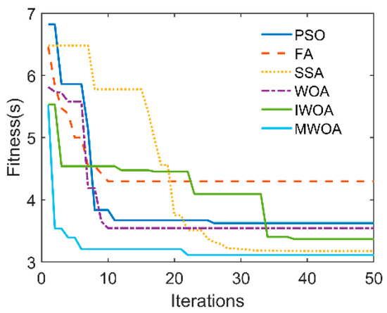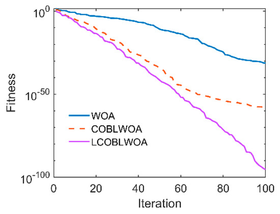 Convergence curves obtained with the WOA, COBLWOA, and LCOBLWOA.