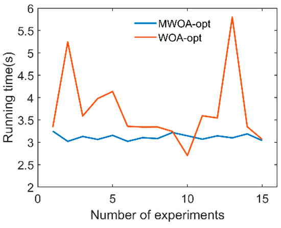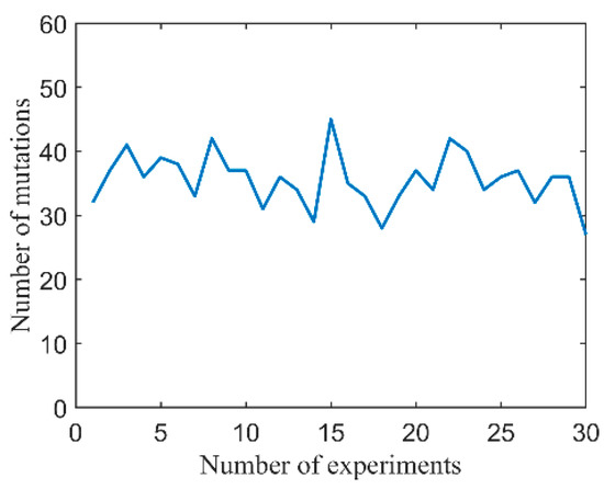 Importantly, all three algorithms had different search boundaries even in the same iteration. For instance, in the 60th iteration, the WOA search boundary was on the magnitude of , while the COBLWOA and the LCOBLWOA were on the magnitude of and , respectively. The gap was greater in the 84th iteration, indicating that the three algorithms had different convergence speeds and convergence accuracies. This was confirmed upon inspection of the convergence curves (Figure 3), which also revealed that the LCOBLWOA had the fastest convergence speed and the highest convergence accuracy. To characterize the LCOBLWOA’s mutation trends, a set of 30 random experiments was run (Figure 4). The average number of mutations was 35.5667, with a standard deviation of 4.1413. This indicates that mutations in the LCOBLWOA occur in a relatively stable fashion. Additionally, experiments with the Cauchy mutation centroid opposition-based learning whale optimization algorithm were implemented with similar results. Taken together, mutation centroid opposition-based learning effectively improved the diversity of the population across all iterations and enhanced the search performance of the WOA.