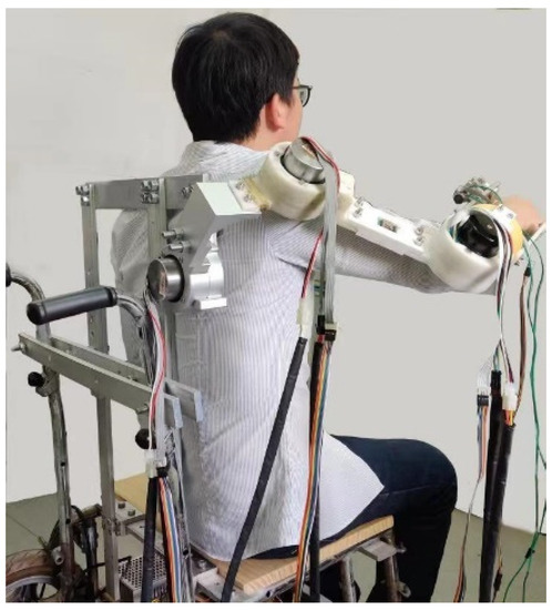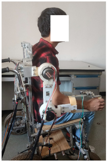 Finally, a pilot rehabilitation experiment was performed on a healthy volunteer. The volunteer was first familiarized with the content of the experiment and then made to wear the 4-DOF UEER robot and sit in a wheelchair with his arms relaxed. The 4-DOF UEER robot moved together with the volunteer’s arm along the planned trajectory, as depicted in Figure 12. Comparisons of position and angular velocity between the simulation and the actual are shown in Figure 13 and Figure 14. Among these joints, the maximum position errors were 0.033 rad (in joint 2), and the maximum angular velocity errors were 0.021 (in joint 3). The motion process remained stable and was completed safely, which verified the feasibility and practical value of the proposed MWOA.