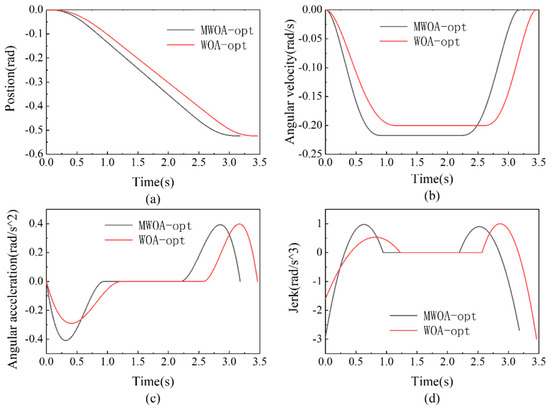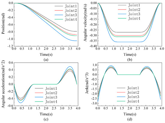 Trajectories of each joint. (a) Position curves of each joint. (b) Angular velocity curves of each joint. (c) Angular acceleration curves of each joint. (d) Jerk curves of each joint.