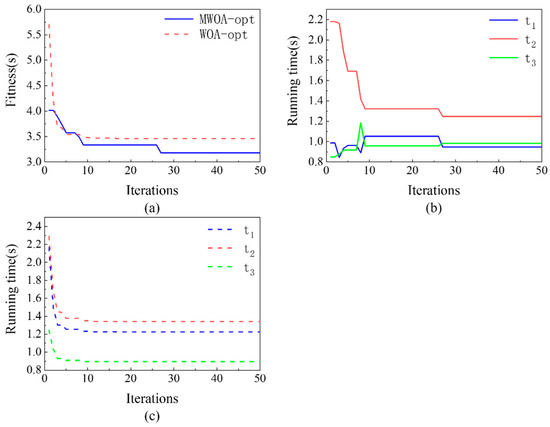 - To tackle the WOA’s shortage in search ability under complex constraints, three strategies were integrated into the proposed MWOA, and the resulting trajectories were compared to those obtained by the original WOA. A dual-population search with a novel communication mechanism to bypass local optimum was used. Mutation centroid opposition-based learning was used to improve the diversity of the population. An adaptive inertia weight mechanism was used to balance the WOA’s exploration and exploitation abilities;