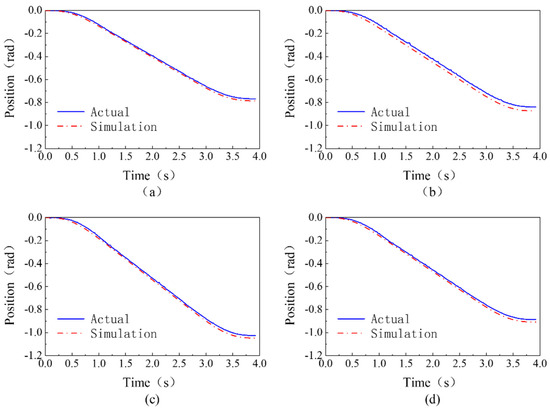 Comparisons of position between the simulation and the actual. (a–d) represent the comparisons of position between the simulation and the actual of joints 1 to 4, respectively.