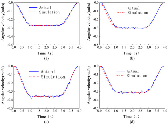 Comparisons of angular velocity between the simulation and the actual. (a–d) represent the comparisons of angular velocity between the simulation and the actual of joints 1 to 4, respectively.