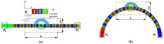 The external rotating field was applied in rectangular regions of width 200 nm, height 10 nm, and adjustable lengths s of 1 nm, 5 nm, 10 nm, 20 nm, 30 nm, 40 nm, 50 nm, 60 nm, 100 nm, 200 nm, and 500 nm. At the square locations P0, P1, and P2 with lateral dimensions 60 nm × 60 nm, the magnetization was detected. P0 senses the external field directly. (a) Straight nanofiber; (b) bent nanofiber.