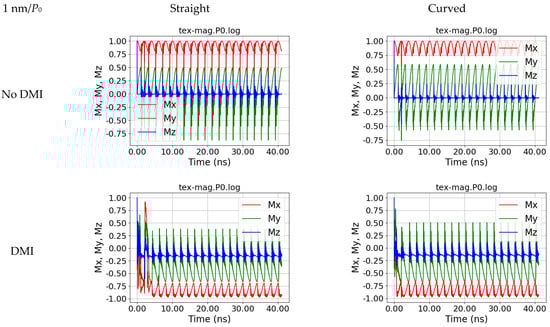 Magnetization dynamics in position P1, i.e., at the right end of the fiber, for a straight and a curved nanofiber, simulated without and with DMI, for s = 1 nm.