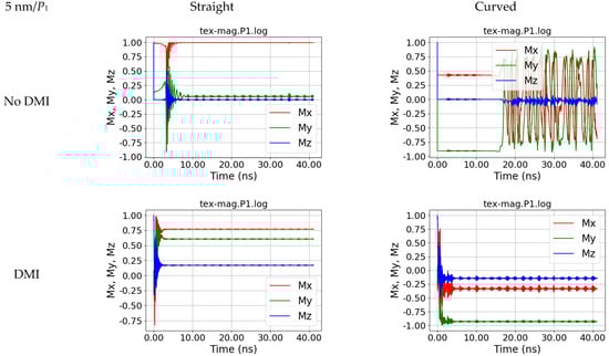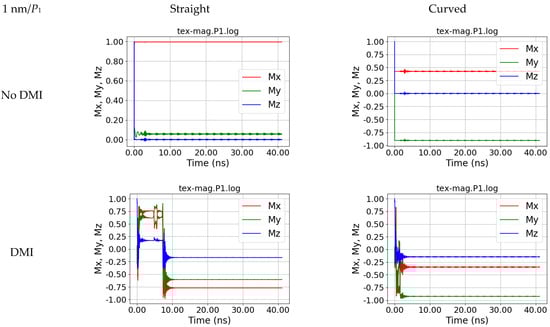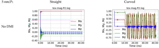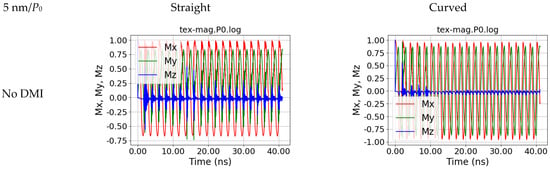 Another point which should be mentioned is that for external magnetic field widths longer than 50 nm, the z-component of the magnetization in P0 is equal to zero after an initial peak in the case of simulations without DMI, while all simulations with DMI show a small z-oscillation in position P0 which can also be attributed to “echoes” of domain wall annihilations near this point. For a better visualization of these effects, movies of the magnetization dynamics of all four cases (with and without DMI, straight and curved samples) for s = 10 nm, 60 nm, and 500 nm are presented in the Supplementary Materials.