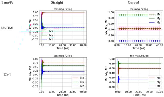 Magnetization dynamics in position P2, i.e., at the left end of the fiber, for a straight and a curved nanofiber, simulated without and with DMI, for s = 1 nm.