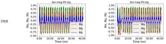 This situation can be examined by investigating the spatially resolved magnetization components, as visible with time-resolution in the form of movies in the Supplementary Materials and as an exemplary image series of My in Figure 5. Here, it is visible that the rotating magnetic field with a length s = 1 nm can change the magnetization in the middle of the straight nanofiber, as visible by the large oscillations in Figure 2 (no DMI, straight fiber); however, the induced domains are not stable, but lose their magnetic orientation during propagation to the ends of the fiber. In this way, no stable domain walls are introduced into the system.