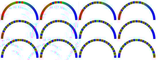 In previous studies, we investigated single and coupled magnetic nanofibers bent in the form of a semi-circle, with one or more “input” positions in which a rotating magnetic field was applied, detecting domain wall motion along the “output” positions at the open ends of these semi-circles, to establish domain wall logics and show truth tables with different operators, depending on the rotational direction of the external magnetic fields [25,26,27]. Here, we concentrate on a single magnetic semi-circle, simulated with and without DMI, and vary the area of the applied external magnetic field to serve as a base for potential data storage and transport spintronics devices.