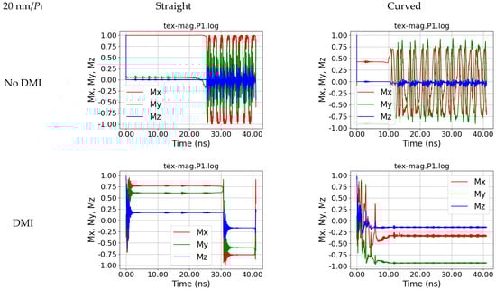 Magnetization dynamics in position P1, i.e., at the right end of the fiber, for a straight and a curved nanofiber, simulated without and with DMI, for s = 20 nm.