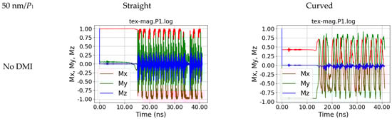 Increasing the length of the input area to 20 nm leads to oscillations also being visible in the straight fiber, simulated without DMI (Figure 10). Neither here nor for input area lengths up to 200 nm are oscillations visible in the nanofibers simulated including DMI (Supplementary Materials, Figures S5–S23).